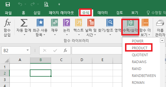 엑셀 PRODUCT함수를 사용하려면 엑셀을 실행시키고 수식 -> 수학/삼각 -> PRODUCT 선택하면 된다.