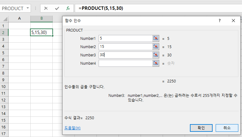 함수 인수 부분에서 PRODUCT함수 number 값을 입력해준다. 순서대로 number1,2,3,4 에 각각 5, 15, 30 형식으로 데이터를 입력해줬다.