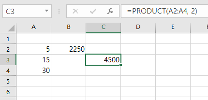 미리 준비해둔 셀 A2 ~ A4 사이의 데이터 값이 존재한다. 다른 빈공간의 셀에 =PRODUCT(A2:A4, 2)을 입력하게 되면, 결과값이 4500이 출력된다. 그 이유는 셀 A2에서 A4 사이의 숫자를 곱한 결과에 2를 곱한 값의 결과이기 때문이다.