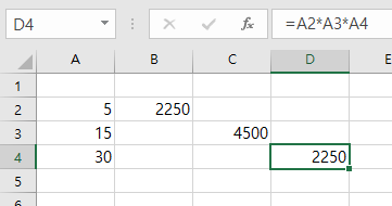 엑셀 PRODUCT 함수 대신에 수학 연산자를 사용하여 셀 A2에서 A4 사이의 숫자를 곱할 수 있게 된다. 결과값은 마찬가지로 2250 값이 출력된다.