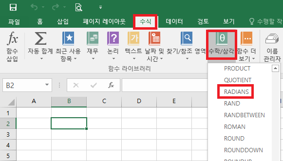 엑셀 RADIANS 함수를 사용하려면 엑셀 -> 수식 -> 수학/삼각 -> RADIANS 선택하면 된다.