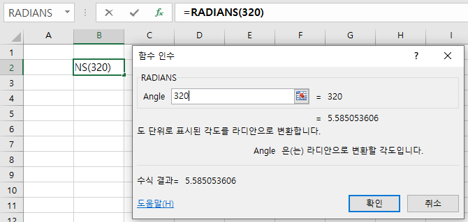 함수 인수에서 Angle값에 320이라는 숫자를 입력하게 되면, 수식결과값은 5.585… 형태로 결과값이 출력된다. 도 단위로 표시된 각도를 라디안으로 변환하게 되는 것이다. Angle은 라디안으로 변환할 각도를 뜻한다.
