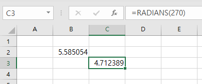 엑셀 셀라인에 바로 =RADIANS(270) 와 같이 함수 수식을 입력해도 된다. 결과값은 4.712389이 출력된다. 270도에 대한 라디안 값을 반환하는 것이다. (4.712389 또는 3π/2 라디안)