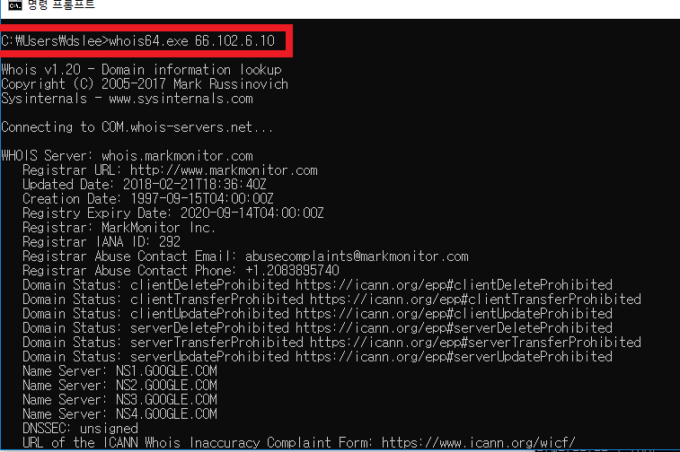마지막으로 whois64.exe IP 주소를 입력함으로써 도메인이나 ip 주소의 위치 세부적인 정보를 확인할 수 있다.