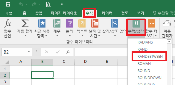 엑셀 실행 후 수식 -> 수학/삼각 -> RANDBETWEEN 선택하면, 랜덤함수 선택이 된다.