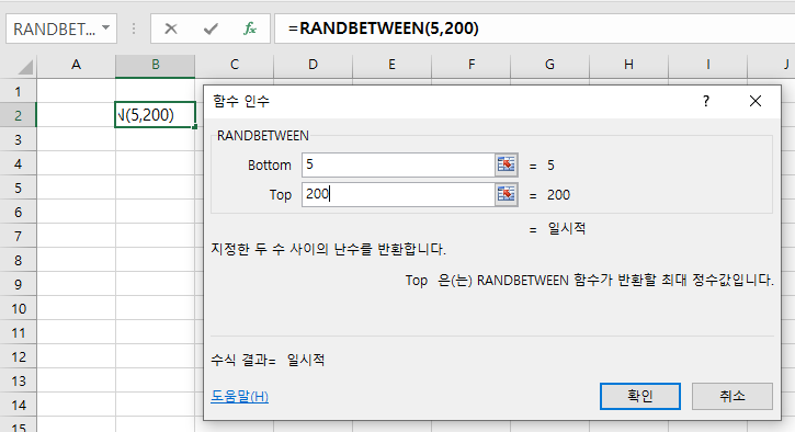 함수 인수 부분에서 bottom 값을 5, top 값을 200 입력하게 되면 지정한 두 수 사이의 난수(무작위숫자) 값이 출력된다. top은 RANDBETWEEN 함수가 반환할 최대 정수값을 뜻한다. 결과수식은 랜덤값이 출력된다.
