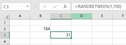마찬가지로 =RANDBETWEEN(1,100) 라는 함수를 입력하게 되면 1 ~ 100 사이의 난수를 반환하게 된다. 값은 당연히 일정하지 않다.