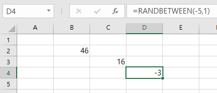 =RANDBETWEEN(-5,1)라는 함수를 입력하게 되면 -5 ~ 1 사이의 난수를 반환하게 된다.