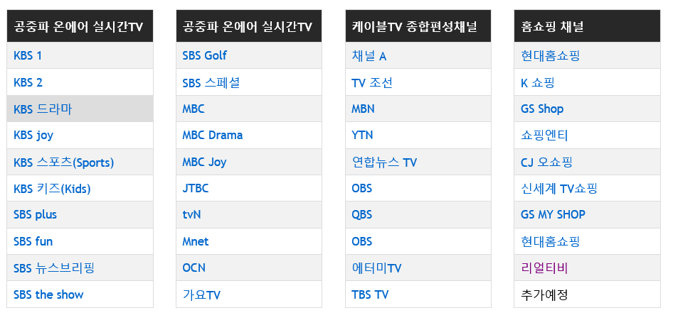 하지만 각 방송사에서는 onair 서비스를 통해 다양한 채널을 소개하고 있여서 무료로 시청이 가능하다. 다만, 회원가입을 해야 무료 온에어 서비스를 이용하는곳도 존재하기 때문에 참고하길 바란다.