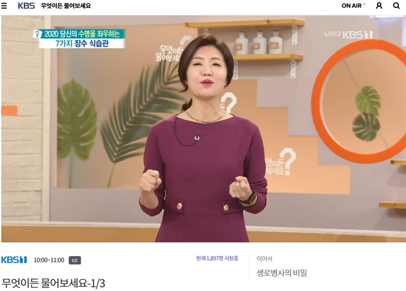 클릭 해서 접속하게 되면, 바로 현재 방송중인 DMB TV 실시간 시청이 가능하다. 2020년 당신의 수명을 좌우하는 7가지 장수 식습관에 대해서 무엇이든 물어보세요가 방송중에 있다.