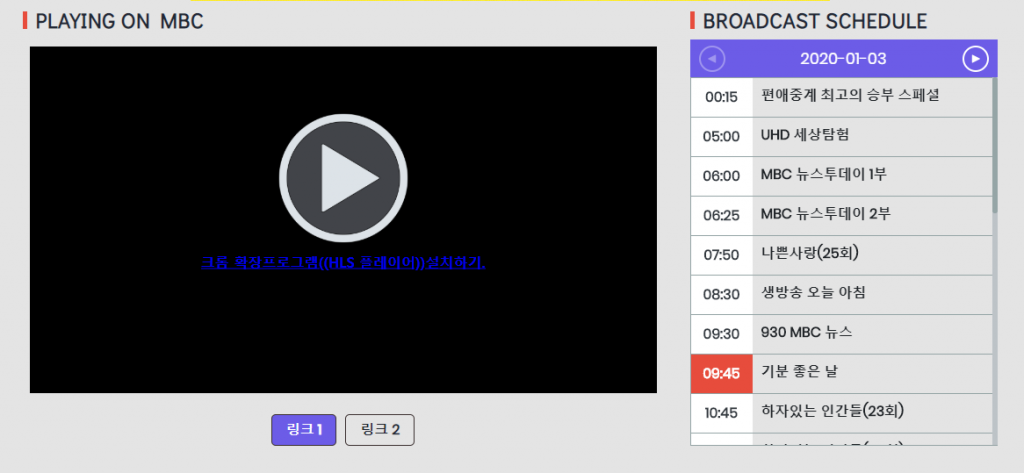 접속하면 playing on mbc 가 처음으로 보이고, 오른쪽 화면에 각 편성표 시간대별로 영상을 시청할 수 있다.