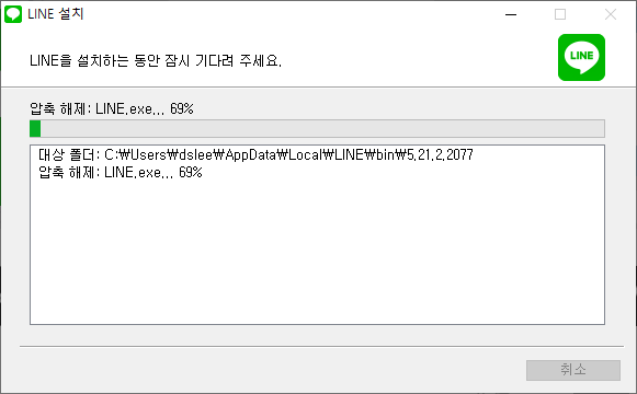 설치가 완료되면 본격적으로 라인(LINE)서버에 접속을 시도한다. Connecting to LINE… 이라는 메시지가 나타나면 정상적으로 접속 중이다.