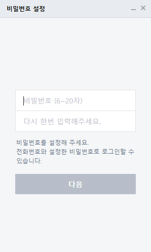 그럼 인증코드가 스마트폰으로 발송되며, 인증번호 4자리를 라인 PC에 입력한다. 그리고 비밀번호 설정 한다.