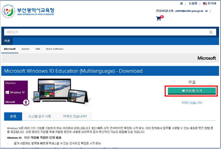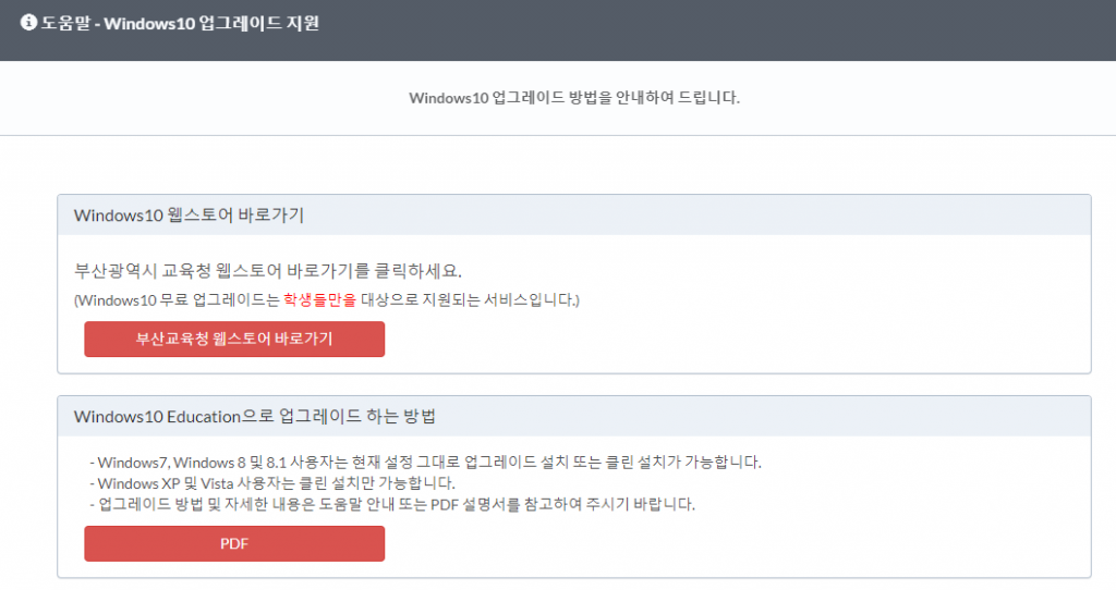 예를들어 부산광역시교육청 홈페이지로 접속해본 모습이다. 윈도우10 무료업그레이드 방법을 소개하고 있는데, 반드시 윈도우10 웹스토어 홈페이지로 접속해야 된다. 물론 부산교육청 웹스토어로 바로가기를 선택한다.