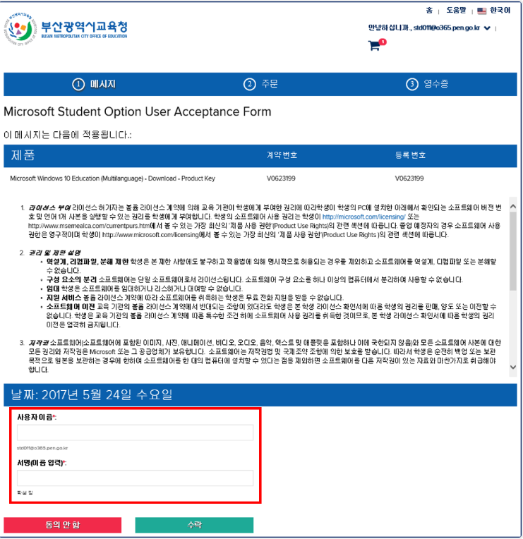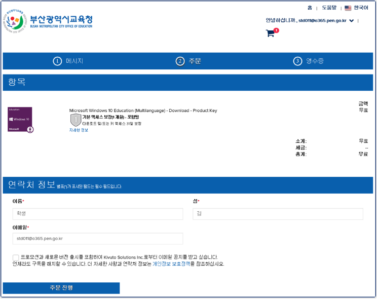 입력된 연락처 정보를 확인한 후 [주문 진행]을 클릭한다. 본인의 계정으로 로그인한다. (소속 교육청에 따라 계정이 달라질 수 있다.)