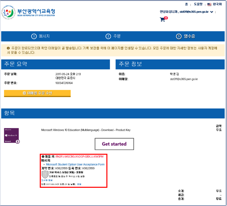 주문이 정상적으로 완료되었다. 발급된 제품키와 다음 페이지의 업그레이드 방법을 참고하여 Windows10으로 업그레이드를 진행하면 된다.