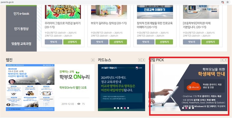 학부모 온누리 사이트에 접속을 하게 되면, 하단에 학부모님을 위한 학생혜택 안내 라는게 보인다. 학생용 클라우드 계정 생성 및 인증을 할 수 있는 사이트이다.