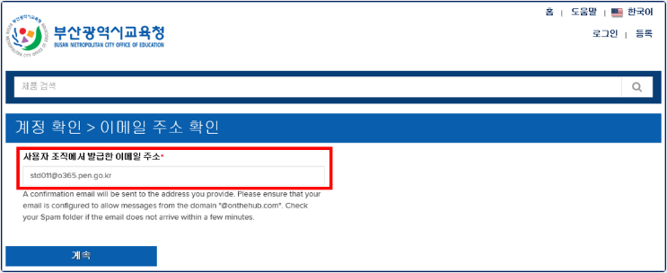 계정생성 사이트를 통해 만든 본인의 이메일 주소를 입력하고 [계속]을 클릭한다. 예를들어 임시초등학교 : test@o365.pen.go.kr