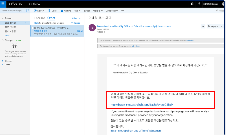 수신된 메일의 내용은 확인한다. 빨간 박스 부분 링크를 클릭한다.