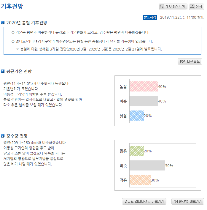 2020년 봄철 기후전망을 보게되면 기온은 평년과 비슷하거나 높겠으나 기온변화가 크겠고, 강수량은 평년과 비슷할 것이다. 엘리뇨/라니냐 감시구역의 해수면온도는 봄철 동안 중립상태가 유지될 가능성이 높다.