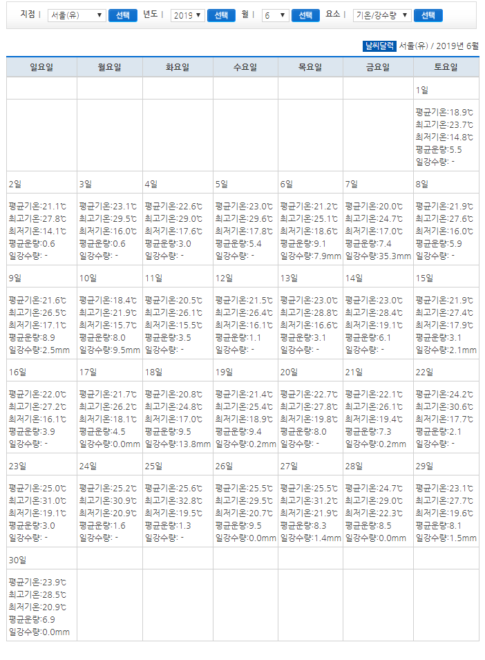 2019년 6월 한달치 날씨를 살펴본다. 평균기옥이 18.9도에서 시작하여 최고 23.7도를 기록하고 있다. 2019년 6월 30일에는 평균기온이 23도 까지 올라갔으며, 최고 28.5도까지 올라가게 되었다. 아마도 2020년도 6월달에도 이와 비슷한 기온을 유지할 것이다.
