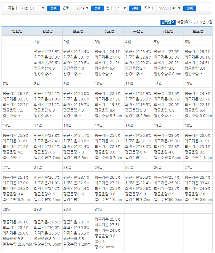 2019년 7월 한달 여름 날씨다. 이제 본격적인 여름을 맞이하는 날씨인데, 2019년 7월1일에는 평균 23도, 최고 28.9도를 기록하고 있다. 2019년 7월31일에는 평균 25.8도, 최고 27.5도를 기록하였는데, 평균기온이 굉장히 상승하였다.