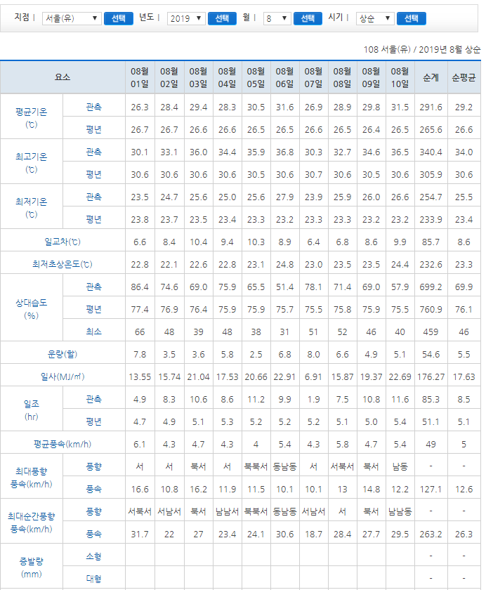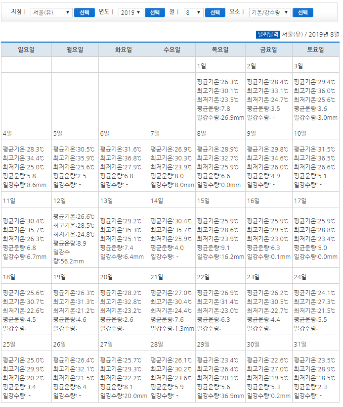 마찬가지로 2019년 8월달 여름 날씨 자료를 바탕으로 분석해보게되면 2020년 8월 여름 날씨도 손쉽게 예측해볼 수 있을것 같다.