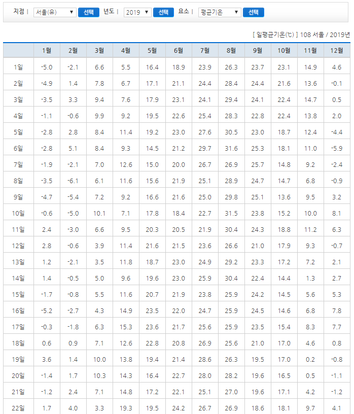 요소별 자료분석을 한 번 보게 되면, 2019년 평균기온을 확인할 수 있다. 대체로 7월 ~ 10월 사이에 온도가 높았으며, 8월달이 가장 더운 여름이었다는걸 확인할 수 있다.