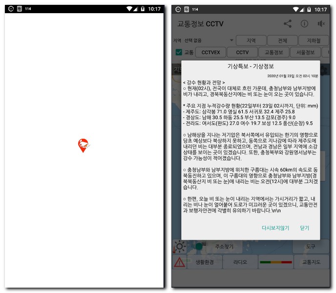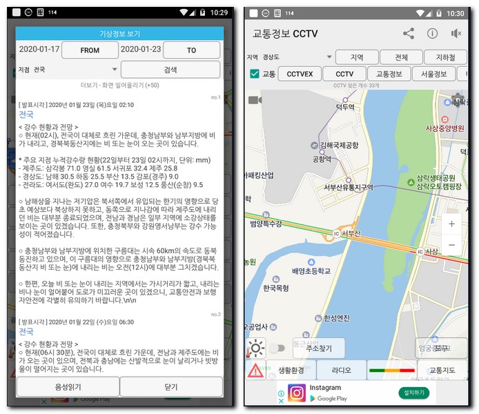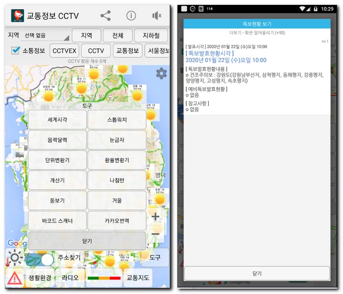 스마트폰 어플앱인 교통정보 CCTV LIVE 고속도로 국도라는 어플이 있다. 이 앱은 처음 구동시 현재 기상특보와 기상날씨를 실시간으로 받아볼 수 있다.