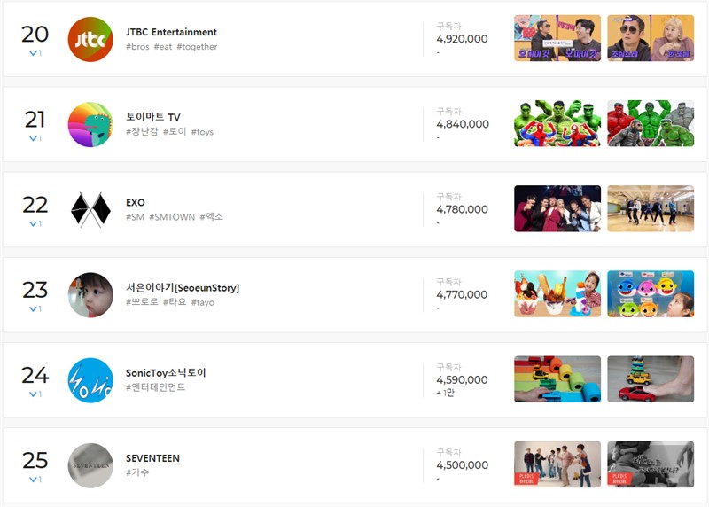 마지막으로 구독자 순위 20위 ~ 25위까지의 순위를 한 번 보자. 20위 JTBC Entertainment, 21위 토이마트 TV, 22위 EXO, 23위 서은이야기, 24위 SonicToy소닉토이, 25위 SEVENTEEN