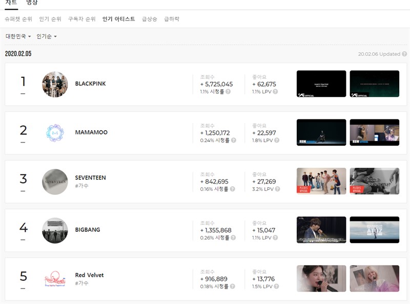 인기아티스트 순위를 보게되면 대부분 구독자 순위나 인기 순위에 랭크된 유튜버들이 포진되어 있다. 유튜브 1위는 단연 BLACKPINK