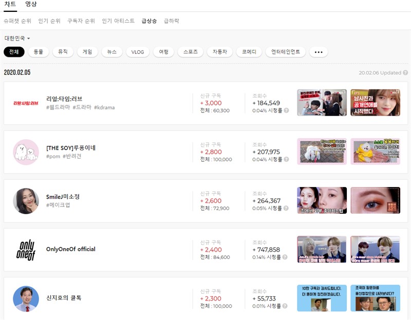급상승 유튜버들도 존재하는데, 리얼 타임 러브, 루퐁이네, 미소정, OnlyOne Of official, 신지호의 콜독 등이 있다.