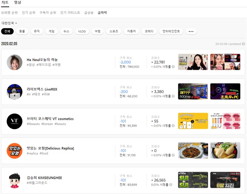 하지만 급하락 중인 유튜버들도 존재한다. Ha Neul오늘의 하늘, 라이브렉스 LiveREX, 브이티 코스메틱 VT cosmetics, 맛있는 모형, 김승희 등이 존재한다.