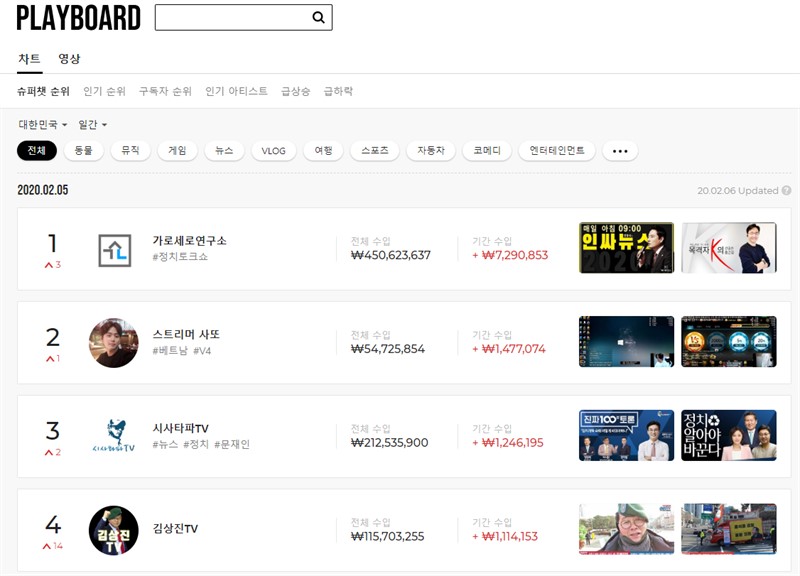 플레이보드라는 웹사이트가 있다. 이곳에서는 슈퍼챗 순위, 인기순위, 구독자 순위, 인기 아티스트, 급상승 순위, 급하락 순위를 실시간으로 확인할 수 있는 웹사이트다.
