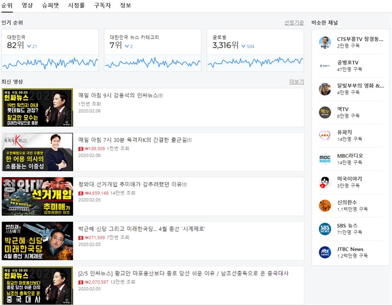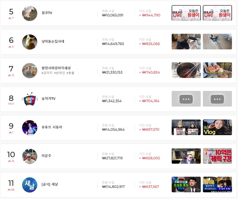 대부분 연예계쪽 유튜버들이 많거나 기업 유튜버들이 있지만, 개인 유튜버들도 종종 보이는 유튜브 구독자 순위였다.