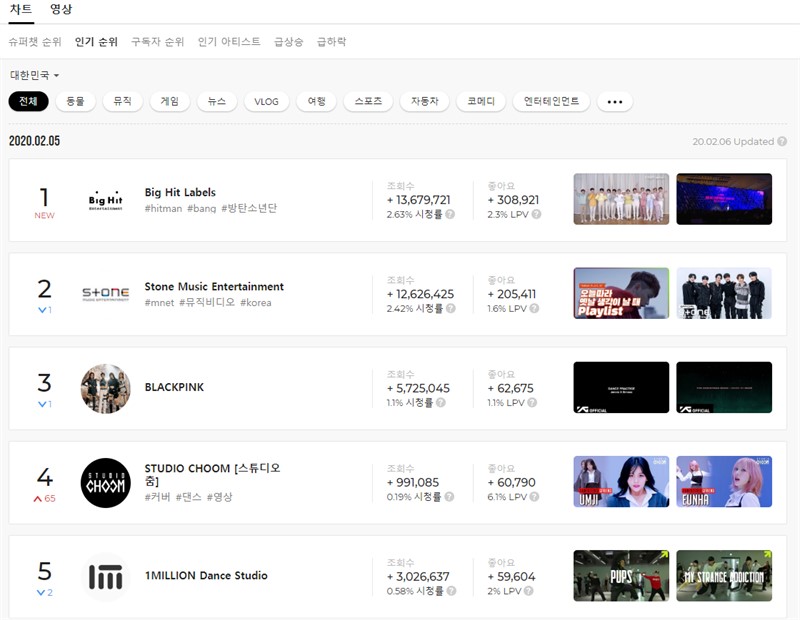 그럼 인기 순위를 한 번 보자 1위는 Big Hit Labels, 2위는 Stone Music Entertainment, 3위는 BLACKPINK, 4위는 STUDIO CHOOM, 5위 1MILLION Dance Studio.