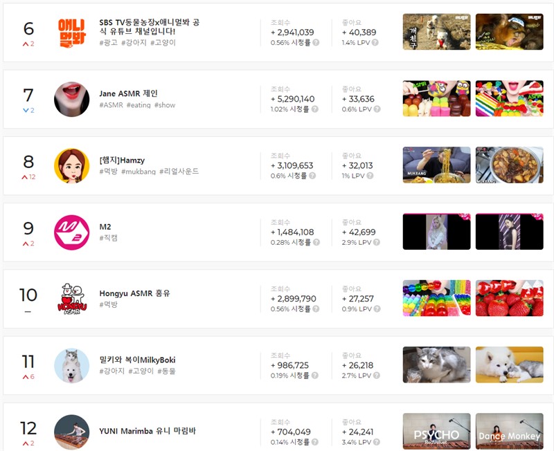 6위부터 12위까지의 순위를 한 번 보자. 6위 SBS TV동물농장x애니멀봐 공식 유튜브 채널입니다, 7위 Jane ASMR 제인, 8위 Hamzy, 9위 M2, 10위 Hongyu ASMR 홍유, 11위 밀키와 복이, 12위 YUNI Marimba 유니 마림바 등이 순위에 진입했다.
