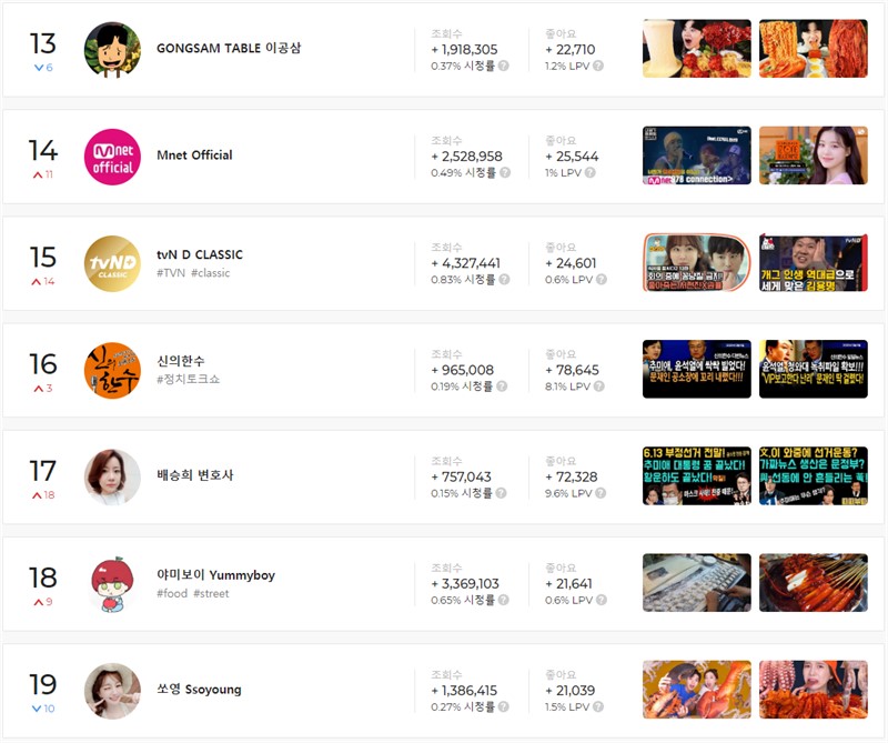 13위부터 19위까지의 순위를 보게되면 이공삼, Mnet Official, tvN D CLASSIC, 신의한수, 배승희 변호사, 야미보이, 쏘영 등이 있다.