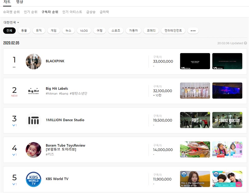 구독자 순위를 한 번 보자. 1위 BLACKPINK, 2위 Big Hit Labels, 3위 1MILLION Dance Studio, 4위 보람튜브 토이리뷰, 5위 KBS World TV