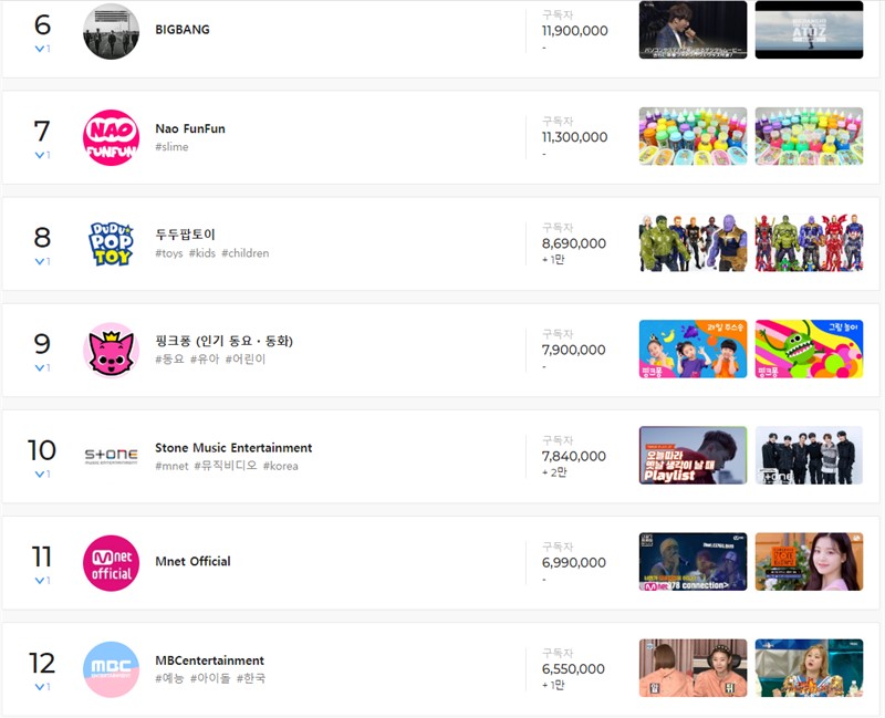 6위는 BIGBANG, 7위 Nao FunFun, 8위 두두팝토이, 9위 핑크퐁, 10위 Music Entertainment, 11위 Mnet Official, 12위 MBCentertainment
