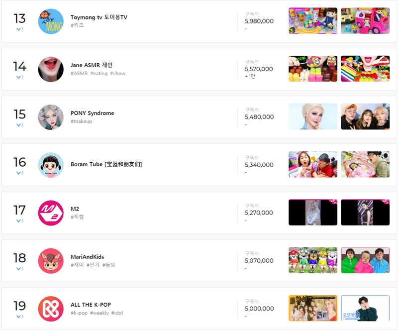 일단 13위는 Toymong tv 토이몽TV, 14위 Jane ASMR 제인, 15위 PONY Syndrome, 16위 Boram Tube, 17위 M2, 18위 MariAndKids, 19위 ALL THE K-POP