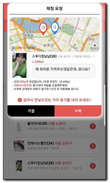 문제는 상대 이성에 대한 것인데, 많이 낚이는 사용자들이 많을 것이다. 일단 3만원 질러봤는데 전부 알바인것으로 판단되었다. 일단 순차적으로 지웠다 다시 가입해도 똑같은 이성이 그대로 연락이 온다.