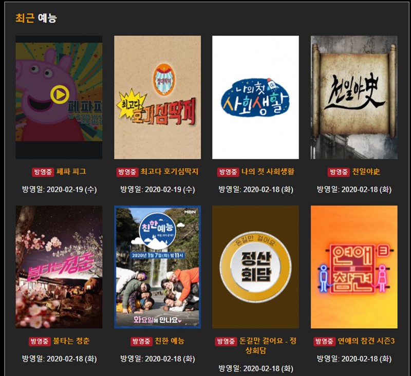최근 업로드 된 예능 프로그램을 살펴보게 되면, 페파 피그, 최고다 호기심딱지, 나의 첫 사회생활, 천일야, 불타는 청춘, 친한 예능, 돈길만 걸어요, 연애의 참견 시즌3 등이 가장 빠르게 업로드 되었다.