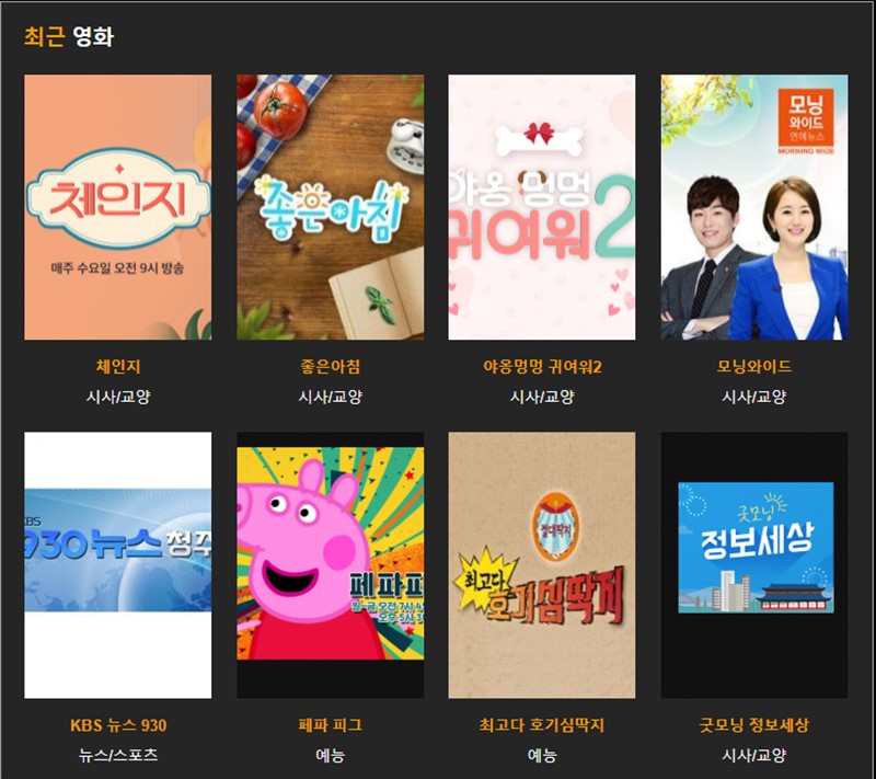 최근 시사 및 뉴스등의 업로드 된 순위를 보게되면, 체인지, 좋은아침, 야옹멍멍 귀여워2, 모닝와이드, KBS 뉴스930, 페파 피그, 최고다 호기심딱지, 굿모닝 정보세상이다.