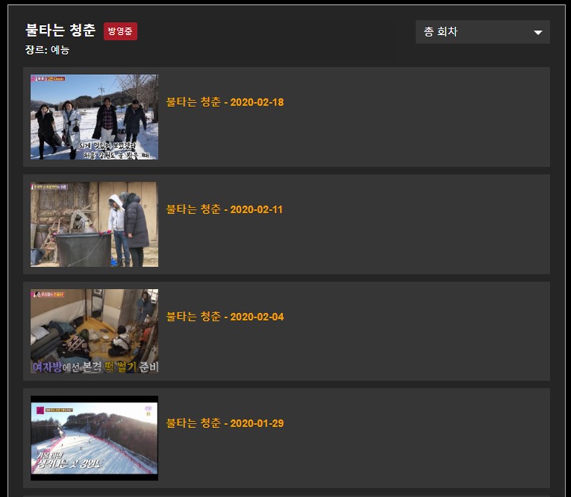 필자는 불타는 청춘을 한 번 선택해봤다. 최근 업로드 된 불차는 청춘을 클릭해서 들어가본다.