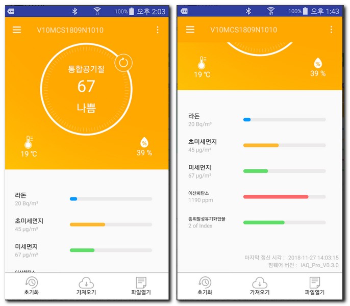 각 오염물질에 대한 기준치는 환경부 실내공기질 기준으로 설정가능하고, 관리수준을 사용자가 직접 정할 수도 있다.
