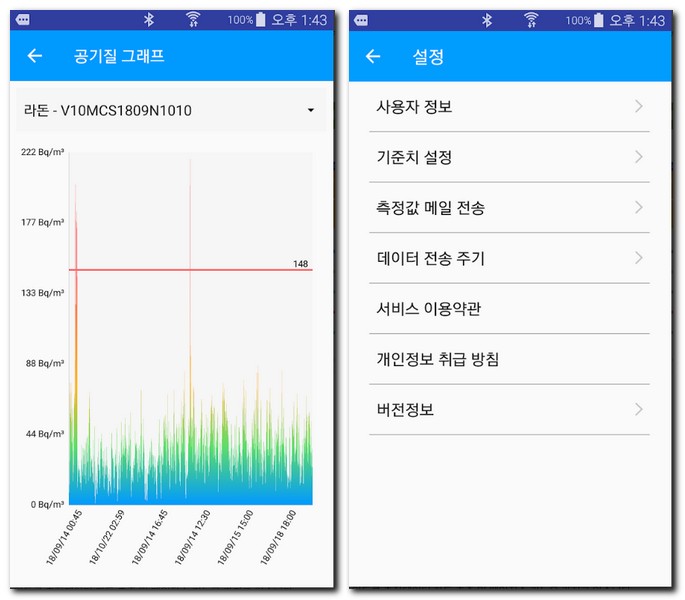 라돈어때는 실내공기질 측정기이며 에어밸류 프로와 마스터와 연동해서 사용된다. 실내 공기질 측정데이터를 보다 손쉽게 확인할 수 있는 어플 앱이다.