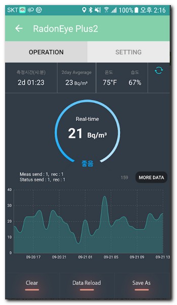 창문을 10분이상 열어서 환기시켜주는것도 잊으면 안된다. 스마트폰 앱으로 데이터를 불러오거나 설정을 바꿀수도 있다. 실내 라돈농도는 낮에 낮고, 새벽에 가장 높게 나타난다.