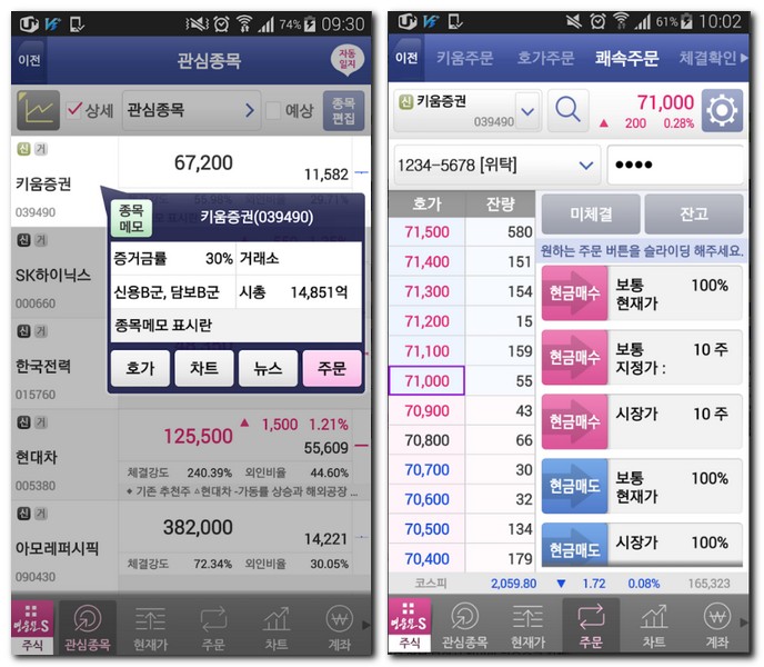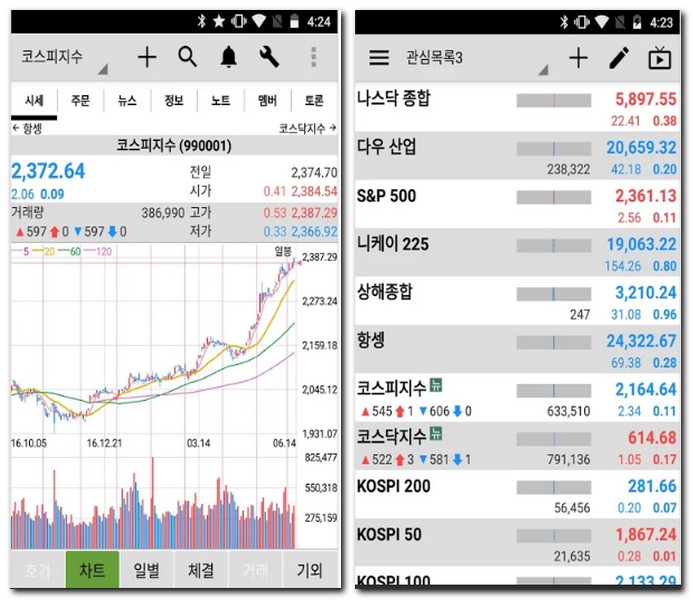 - 관심 종목 및 지수, 상품, 환율 등 펹딥 가능