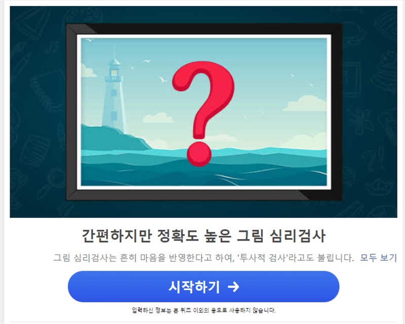 그림 심리테스트 사이트에서는 특정 사진을 하나 보여주면서 사용자에게 이 그림에 대해서 어떻게 생각하는지 또는 그림을 그려보라는 식으로 유도한다. 그와 동시에 심리테스트가 진행되는것이다.